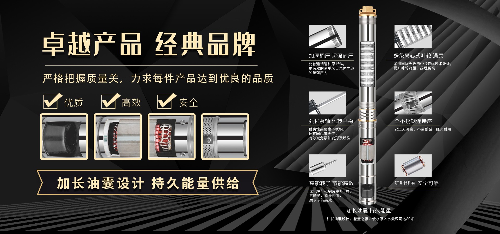 不僅僅是泵,更是流動的科技。十多年來,本公司堅持走:以質量求生存以科技創(chuàng)新求發(fā)展,重合同守信用的道路,生產(chǎn)經(jīng)營得到迅速發(fā)展。更希望以后不管從發(fā)達城市到新農村,從工業(yè)制造到尖端科技產(chǎn)業(yè)都隨處可見創(chuàng)江井泵的身影,創(chuàng)江深井泵已成為干萬用戶心目中優(yōu)質和信心的保證我們將以優(yōu)質的產(chǎn)品和最完善的售后服務來真誠與各界朋友開展廣泛的合作,共同創(chuàng)造一個美好的未來!